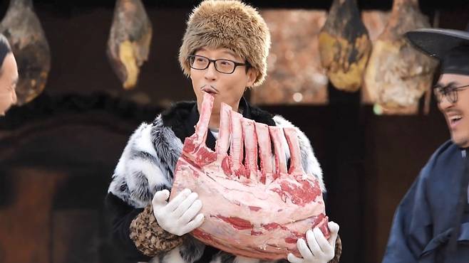 공개된 사진 속 '유산적'으로 변신한 유재석이 토마호크 생고기를 들고 흥을 폭발시킨 모습이 담겨 있다.