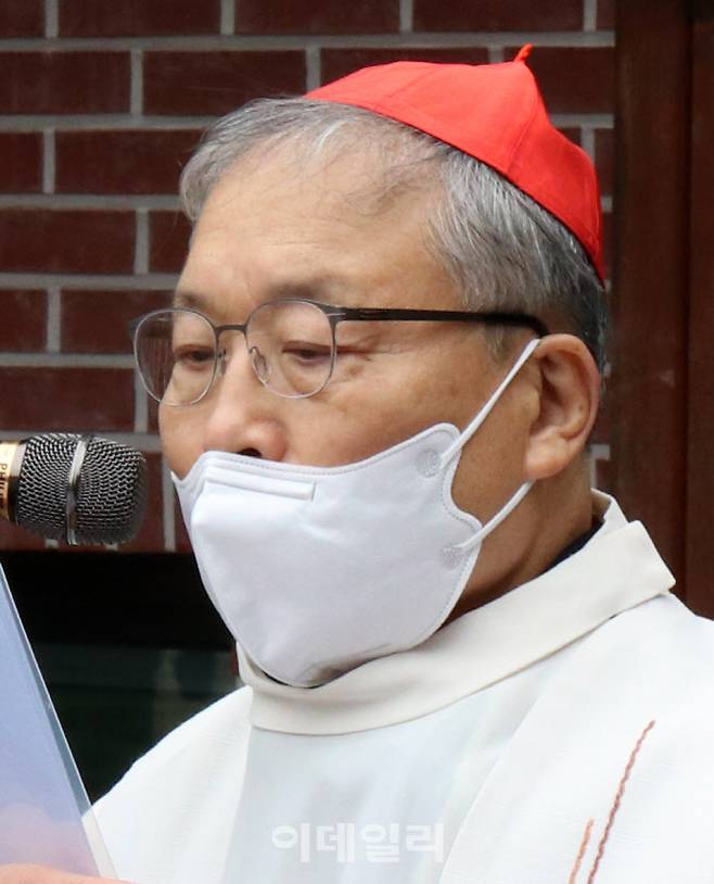 [이데일리 방인권 기자] 염수정 천주교 추기경(서울대교구장)이 22일 오후 명동성당 안쪽 옛 계성여중고 샛별관 앞에서 열린 ‘명동밥집’과 이주·난민 쉼터 ‘베다니아의 집’ 현판식에 참석해 축복식을 주례하고 있다. 천주교 서울대교구 제공.