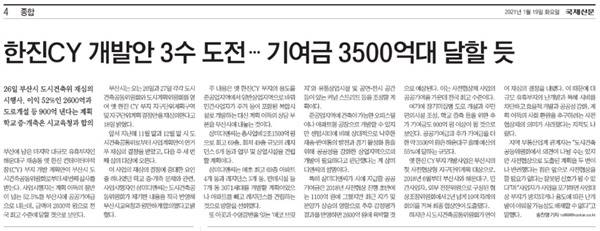 먼저 국제신문은 1월 19일 4면 <한진CY 개발안 3수 도전…기여금 3500억대 달할 듯> 에서 재심의 일정을 전하면서 재심의 요인 중 하나였던 학교 증·개축 문제는 사업시행사인 삼미디앤씨측과 부산시교육청이 원만하게 합의했다고 보도했습니다.