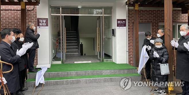 (서울=연합뉴스) 22일 오후 서울 중구 명동성당에서 열린 무료급식소 '명동밥집' 개소식에서 관계자들이 현판 제막을 하고 있다. 2021.1.22