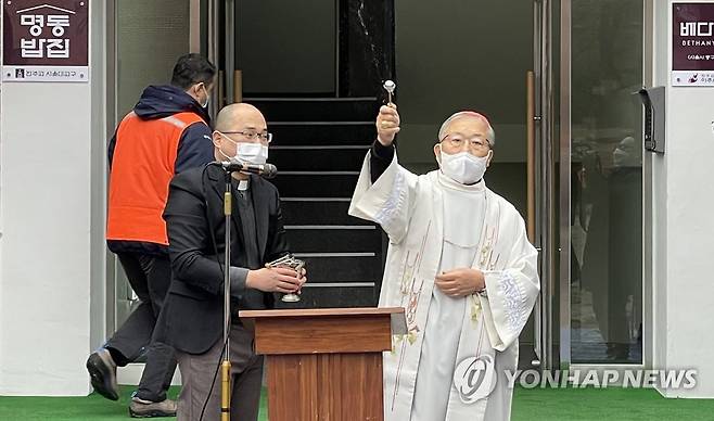 (서울=연합뉴스) 22일 오후 서울 중구 명동성당에서 열린 무료급식소 '명동밥집' 축복식에서 염수정 추기경이 주례하고 있다. 2021.1.22
