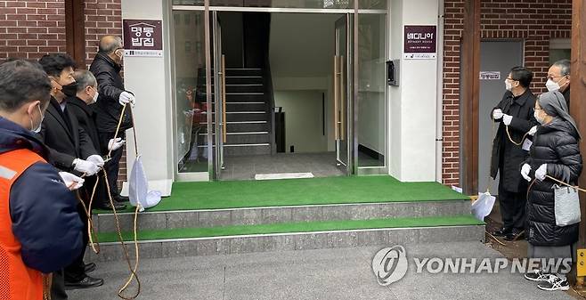 (서울=연합뉴스) 22일 오후 서울 중구 명동성당에서 열린 무료급식소 '명동밥집' 개소식에서 관계자들이 현판 제막을 하고 있다. 2021.1.22