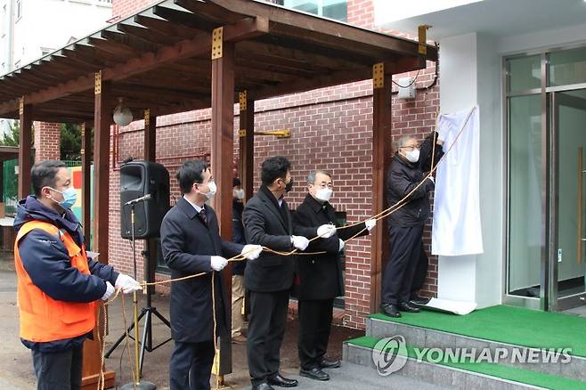(서울=연합뉴스) 22일 오후 서울 중구 명동성당에서 열린 무료급식소 '명동밥집' 개소식에서 관계자들이 현판 제막을 하고 있다. 2021.1.22