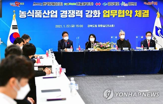(서울=연합뉴스) 한국암웨이가 22일 경상북도청에서 나눔제약 및 경상북도, 영천시와 건강기능식품 공동 연구개발을 위한 '상생 협력 업무 협약식'을 진행했다.