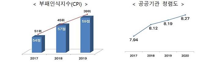 ㅇ 그 결과, 국제투명성기구(TI)가 발표하는 부패인식지수(CPI)가 3년 연속 대폭 상승해 2019년에는 역대 최고점수(59점)로 세계 39위를 기록하고, 공공기관 청렴도도 4년 연속 상승하는 성과가 있었다.