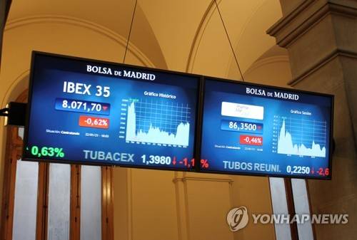 epa08957182 Screens show the evolution of the Spanish index IBEX 35 at the stock market in Madrid, Spain, 22 January 2021. The IBEX 35 dropped a 0.78 per cent at the start of the trading day down to 8,063.90 points due to the global outbreaks of coronavirus and the fear of new restrictions. EPA/ANA BORNAY