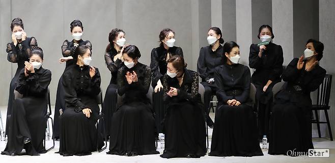 | ▲ '베르나르다 알바' 화기애애한 호흡 22일 오후 서울 중구 정동극장에서 열린 2021 정동극장 뮤지컬 <베르나르다 알바> 드레스 리허설에서 출연배우들이 포토타임을 갖고 있다. <베르나르다 알바>는 20세기 스페인의 대표 시인이자 극작가인 페데리코 가르시아 로르카의 '베르나르다 알바의 집'을 원작으로 한 뮤지컬로, 베르나르다 알바가 남편의 8년상을 치르는 동안 다섯 딸들에게 절제된 삶을 강요하는 강압적 통치와 가족들의 욕망, 감정의 소용돌이와 대립이 불러일으키는 파국의 이야기를 다룬 작품이다. 1월 22일부터 3월 14일까지 공연. |