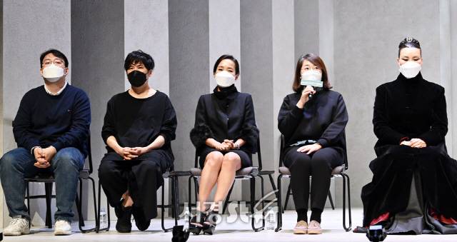 연태흠 연출, 김성수 음악감독, 이혜정 안무가, 이수현 정동극장 공연기획팀장, 프로듀서 정영주(왼쪽부터)가 22일 오후 서울 중구 정동극장에서 열린 뮤지컬 '베르나르다 알바' 프레스콜에 참석하고 있다.