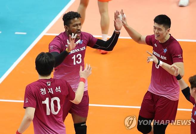 대한항공 새 외국인 선수 요스바니 에르난데스가 공격 성공 뒤 동료들과 기뻐하고 있다. 2021.1.22