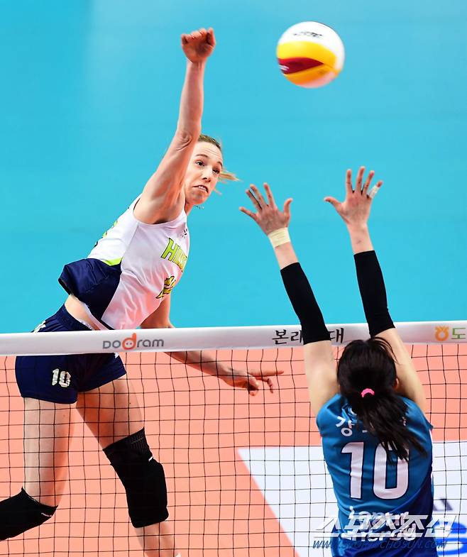 2020-2021 프로배구 V리그 여자부 GS칼텍스와 현대건설의 경기가 22일 서울장충체육관에서 열렸다. 현대건설 루소가 GS칼텍스 강소휘의 블로킹 사이로 스파이크를 강타하고 있다. 장충=최문영 기자 deer@sportschosun.com /2021.01.22/