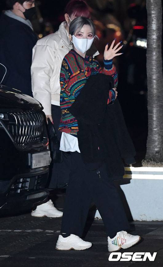 (여자)아이들 소연이 차에서 내려 방송국으로 향하며 인사하고 있다. / rumi@osen.co.kr
