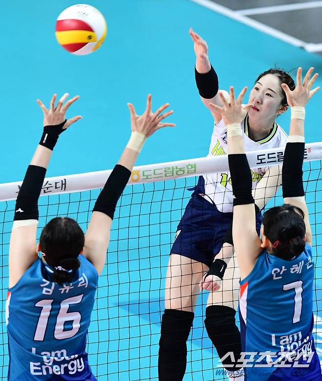 2020-2021 프로배구 V리그 여자부 GS칼텍스와 현대건설의 경기가 22일 서울장충체육관에서 열렸다. 현대건설 고예림이 GS칼텍스 김유리, 안혜진의 블로킹 사이로 스파이크를 강타하고 있다. 장충=최문영 기자 deer@sportschosun.com /2021.01.22/