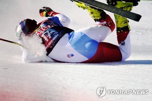 epa08957449 Urs Kryenbuehl of Switzerland crashes during the men's Downhill race of the FIS Alpine Skiing World Cup event in Kitzbuehel, Austria, 22 January 2021. EPA/CHRISTIAN BRUNA