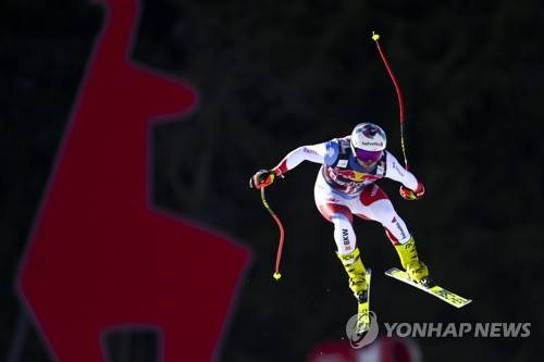 epa08957461 Urs Kryenbuehl of Switzerland in action during the men's Downhill race of the FIS Alpine Skiing World Cup event in Kitzbuehel, Austria, 22 January 2021. EPA/CHRISTIAN BRUNA