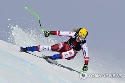 epa08957526 Tamara Tippler of Austria in action during the women's Downhill race of the FIS Alpine Skiing World Cup in Crans-Montana, Switzerland, 22 January 2021. EPA/JEAN-CHRISTOPHE BOTT