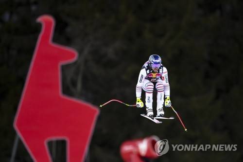 epa08957535 Maxence Muzaton of France in action during the men's Downhill race of the FIS Alpine Skiing World Cup event in Kitzbuehel, Austria, 22 January 2021. EPA/CHRISTIAN BRUNA