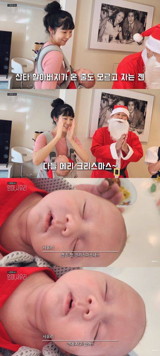 한편 잠에서 깬 젠은 엄마 품에서 다시 잠들었다. 그 사이에 산타클로스 할아버지로 분장 한 사유리의 아빠가 등장했다. 사유리의 아빠는 "젠 메리크리스마스"라며 초를 붙인 케이크를 들고 왔다. 이어 "급하게 와서 피곤하다"며 "루돌프는 밖에 있는데, 바이러스를 피해서 왔다"며 재치있게 말했다.