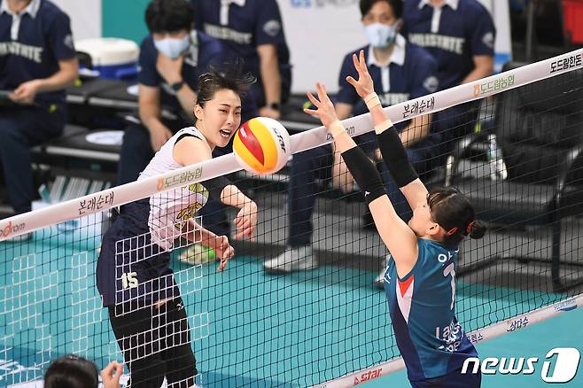 (서울=뉴스1) 민경석 기자 = 22일 서울 중구 장충체육관에서 열린 2020-2021 프로배구 V리그 여자부 GS칼텍스와 현대건설의 경기에서 현대건설 황민경이 공격을 시도하고 있다.(현대건설 배구단 제공) 2021.1.22/뉴스1