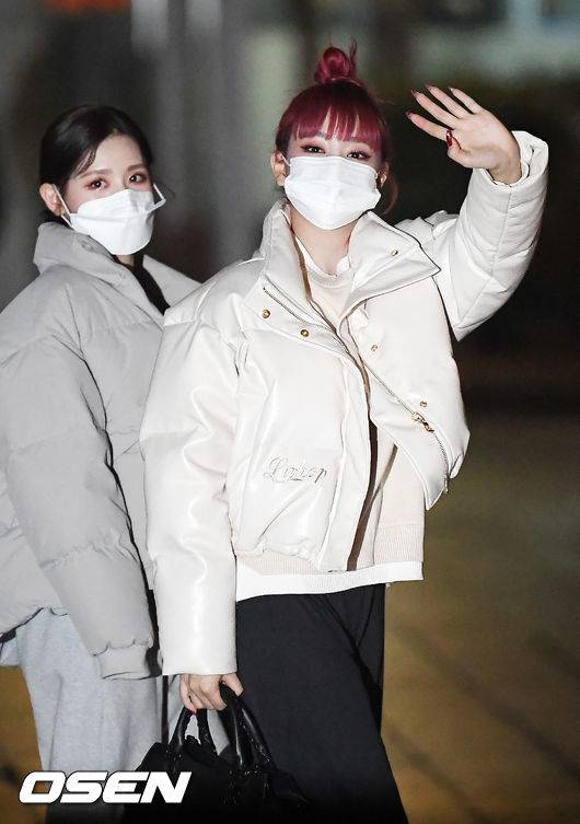 (여자)아이들 민니와 미연이 차에서 내려 방송국으로 향하며 인사하고 있다. / rumi@osen.co.kr