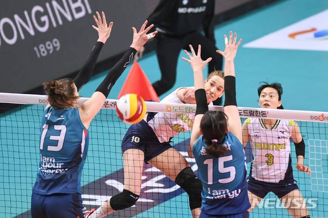 [서울=뉴시스] 박미소 기자 =22일 서울 중구 장충체육관에서 열린 도드람 2020-2021V리그 현대건설과 GS칼텍스와의 경기, 현대건설 루소가 공격하고 있다.(사진=현대건설배구단 제공) 2021.01.22. photo@newsis.com