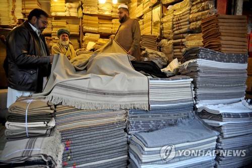 epa08957573 A Pakistani man sells traditional Chitrali woolen blankets as winter season begins, in Peshawar, 22 January 2021. People use the Chitrali woolen blanket to cover themselves to beat the cold winter. EPA/ARSHAD ARBAB