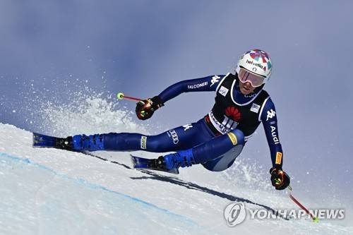 epa08957575 Marta Bassino of Italy in action during the women's Downhill race of the FIS Alpine Skiing World Cup in Crans-Montana, Switzerland, 22 January 2021. EPA/JEAN-CHRISTOPHE BOTT