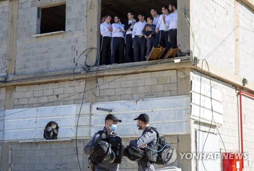 Ultra-Orthodox Jewish seminary students look at Israeli police as they arrived to shutter the Jewish seminary that had opened in violation of coronavirus lockdown rules in Ashdod, Israel, Friday, Jan. 22, 2021. Israeli Police have clashed on a number of occasions in recent days with members of the ultra-Orthodox community, some of whom have defied lockdown rules to open educational institutions or hold large gatherings despite surging virus cases. (AP Photo/Ariel Schalit)