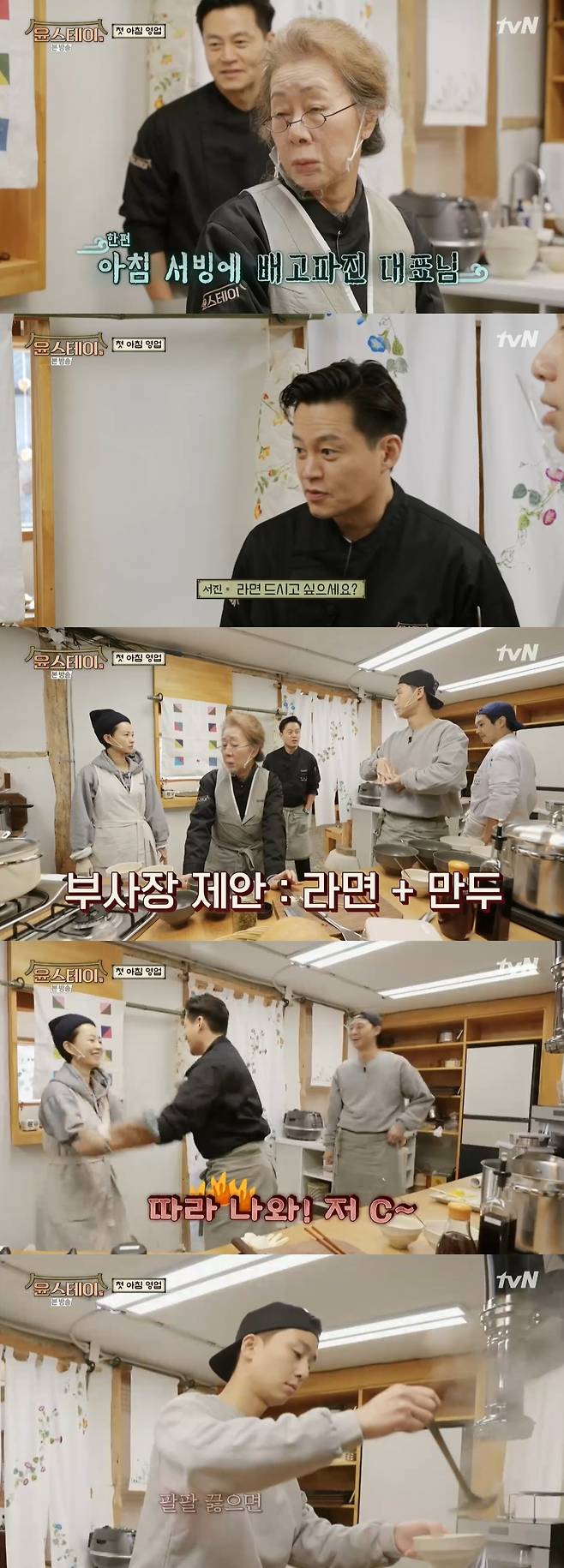 하지만 주방에 들어온 윤여정은 아침 서빙에 친절한 설명까지 열일 하고 나자 배가 고프다면서 라면을 먹자고 말했다.