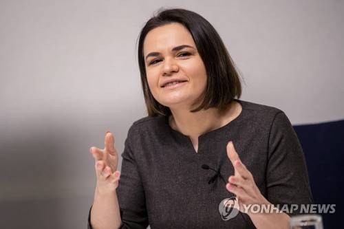 Belarusian opposition leader Sviatlana Tsikhanouskaya gestures during a news conference after talks with Estonian Prime Minister Juri Ratas in Tallinn, Estonia, Friday, Jan. 22, 2021. (AP Photo/Raul Mee)