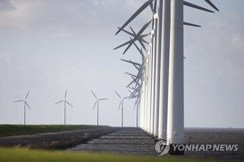 Wind turbines are seen on a dike near Urk, Netherlands, Friday, Jan. 22, 2021. A group of scientists, including five Nobel laureates, called Friday for more action to adapt the world to the effects of climate change, drawing comparisons with the faltering response to the coronavirus crisis, ahead of a major online conference on climate adaptation starting Monday and hosted by the Netherlands. (AP Photo/Peter Dejong)