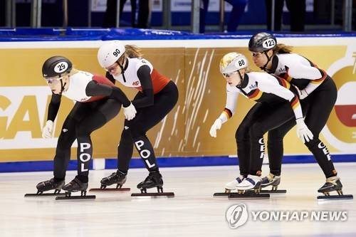 epa08957653 (L-R) Kamila Stromowska and Gabriela Topolska of Poland and Germany's Gina Jacobs and Anna Katharina Gaertner in action during the women's 3000 m relay heats at the ISU European Short Track Championships at the Hala Olivia in Gdansk, nothern Poland, 22 January 2021. EPA/Adam Warzawa POLAND OUT