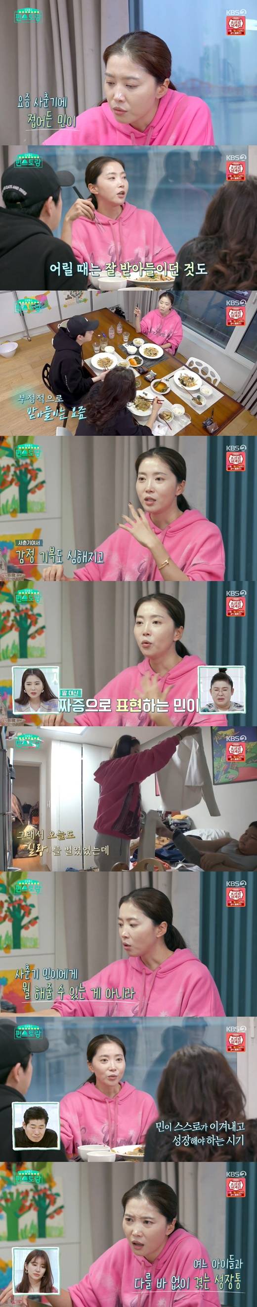 이날 오윤아는 뮤지컬배우 홍지민이 민이에 대해 묻자 "민이는 요즘 사춘기"라며 "옛날엔 순수하게 말 시키고 하면 잘 하고 그랬는데 요즘에는 너무 부정적이다"고 고백했다.