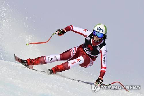 epa08957665 Mirjam Puchner of Austria in action during the women's Downhill race of the FIS Alpine Skiing World Cup in Crans-Montana, Switzerland, 22 January 2021. EPA/JEAN-CHRISTOPHE BOTT