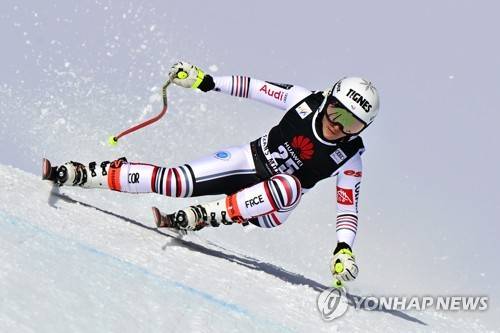 epa08957666 Tiffany Gauthier of France in action during the women's Downhill race of the FIS Alpine Skiing World Cup in Crans-Montana, Switzerland, 22 January 2021. EPA/JEAN-CHRISTOPHE BOTT