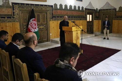 epa08957677 Afghani President Ashraf Ghani Ahmadzai speaks to journalists during a press conference at his visit to change the name of the Herat International Airport to Khwaja Abdullah Ansari Airport, in Herat, Afghanistan, 22 January 2021. Ghani will hold separate meetings with civil, military officials, ulema, women, youth and members of the provincial council, civil society activists and businessmen. EPA/JALIL REZAYEE