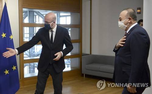 epa08957684 European Council President Charles Michel (L) gestures as he meets with Turkish Foreign Minister Mevlut Cavusoglu to discuss Turkey-EU ties in Brussels, Belgium, 22 January 2021. EPA/JOHANNA GERON / POOL