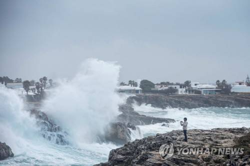 epa08957693 Big waves hit the coast in Binidali area in Mahon city, Menorca island, Balearics, Spain, 22 January 2021. Eighteen out of nineteen Spanish regions (all of them except for the Canaries) are on the alert due to the low pressure brought by storm Hortense, which will cause gusts of wind of up to 120 kilometres per hour, waves up to 8 meters high and snowfalls in mountain areas. EPA/DAVID ARQUIMBAU SINTES
