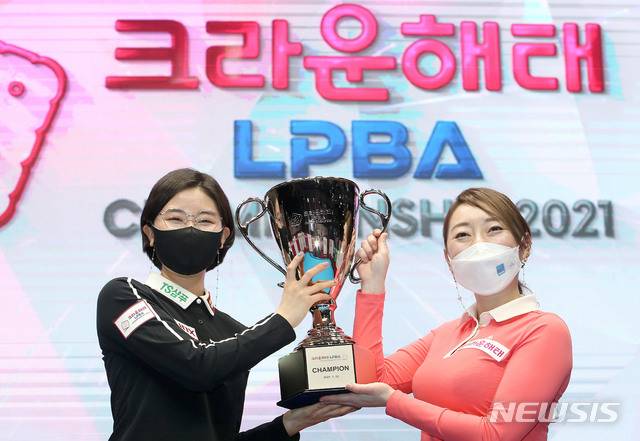 [서울=뉴시스] 박미소 기자 = 22일 서울 강서구 메이필드호텔에서 열린 크라운해태 PBA-LPBA 챔피언십 2021 대회 여자 결승전에서 우승한 이미래와 준우승한 박수아가 트로피를 들고 기념촬영을 하고 있다. (사진=PBA 투어 제공) 2021.01.22. photo@newsis.com
