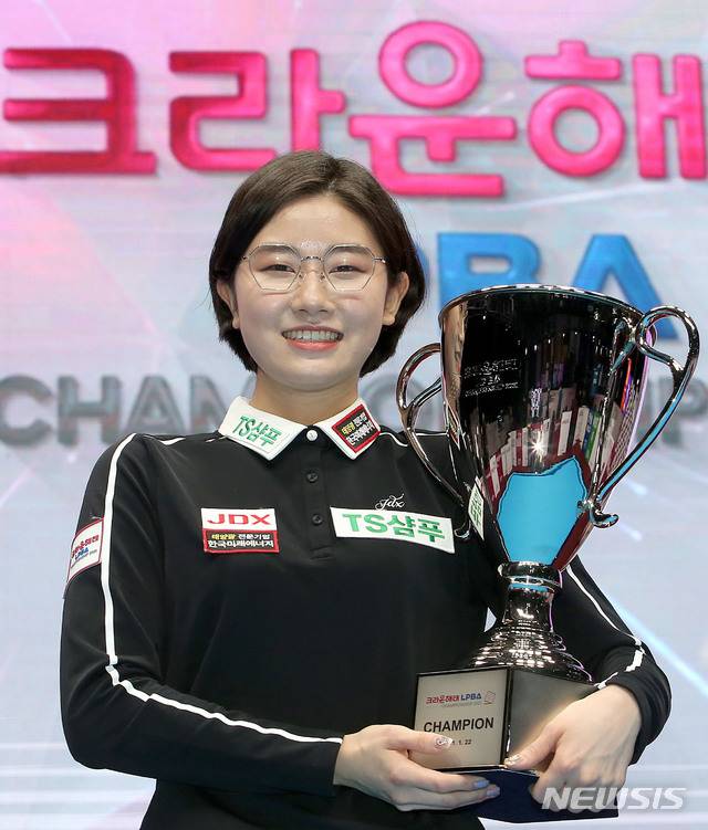 [서울=뉴시스] 박미소 기자 = 22일 서울 강서구 메이필드호텔에서 열린 크라운해태 PBA-LPBA 챔피언십 2021 대회 여자 결승전에서 우승한 이미래가 트로피를 들고 기념촬영을 하고 있다. (사진=PBA 투어 제공) 2021.01.22. photo@newsis.com