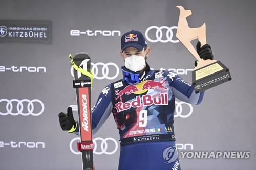 epa08957719 Third placed Dominik Paris of Italy celebrates on the podium after the men's Downhill race of the FIS Alpine Skiing World Cup event in Kitzbuehel, Austria, 22 January 2021. EPA/CHRISTIAN BRUNA