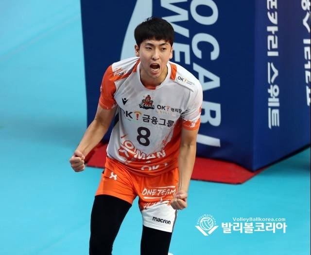 【발리볼코리아닷컴(안산)=김경수 기자】 22일(금) 경기도 안산시 상록수체육관에서 열린 프로배구 2020-2021 V리그 4라운드 남자부 OK금융그룹 vs 대한항공 안산경기에서 OK금융그룹 차지환이 대한항공 공격을 블로킹 시키고 기뻐하고 있다. 2021. 1.22.