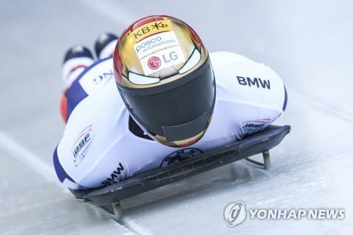 Korean skeleton pilot Sungbin Yun competes on the artificial ice track at the men's world cup at Koenigssee, Germany, Friday, Jan.22, 2021. (Tobias Hase/dpa via AP)