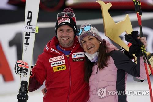 Switzerland's Beat Feuz celebrates with his girlfriend Katrin Triendl after winning an alpine ski, men's World Cup downhill in Kitzbühel, Austria, Friday, Jan. 22, 2021. (AP Photo/Giovanni Auletta)