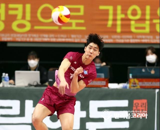 【발리볼코리아닷컴(안산)=김경수 기자】 22일(금) 경기도 안산시 상록수체육관에서 열린 프로배구 2020-2021 V리그 4라운드 남자부 OK금융그룹 vs 대한항공 안산경기에서 대한항공 임재영이 서브를 넣고 있다. 2021. 1.22.