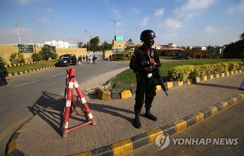 epa08957756 Pakistani security officials stand guard outside National Stadium, as Pakistani Cricket team attends a practice session ahead of Cricket series with visiting South African Cricket team, in Karachi, Pakistan, 22 January 2021. The South African cricket squad arrived in Pakistan for their first tour consisting of two Test and three T20 matches after a 14-year break. EPA/SHAHZAIB AKBER