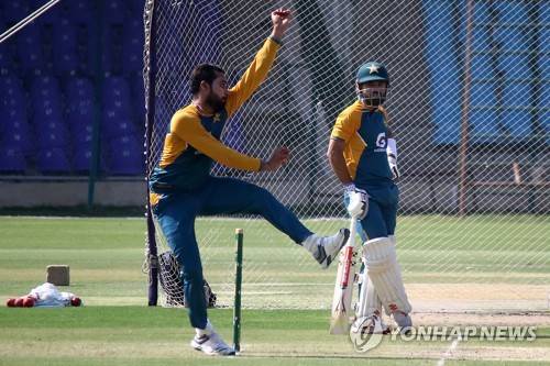 epa08957768 Pakistani bowler Fahim Ashraf (L) attends a practice session ahead of Cricket series with visiting South African Cricket team, in Karachi, Pakistan, 22 January 2021. The South African cricket squad arrived in Pakistan for their first tour consisting of two Test and three T20 matches after a 14-year break. EPA/SHAHZAIB AKBER