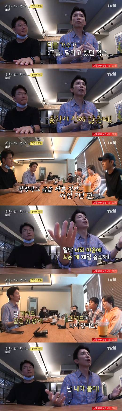 유희열이 밤새 만든 곡을 처음 만나기 위해 안테나뮤직을 찾은 젝스키스. 유희열은 "사실 곡을 달라는 가수들의 요청을 정말 많이 받는데, 내가 작정하고 이렇게 곡을 쓴 건 7년 만이다"며 젝스키스와의 협업에 담긴 의미를 강조했다.