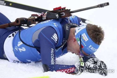 Fourth placed Lukas Hofer of Italy lies on the ground after crossing the finish line during the men's 20km individual race at the Biathlon World Cup in Anterselva, Italy, Friday, Jan. 22, 2021. (AP Photo/Matthias Schrader)