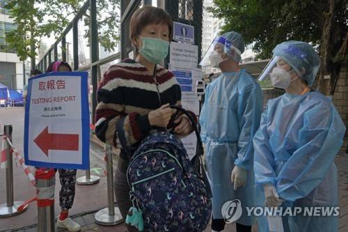 Medical workers in protective suits assist residents at a temporary testing center of the COVID-19, in the Yau Ma Tei area, in Hong Kong, Friday, Jan. 22, 2021. Hong Kong's Yau Ma Tei area is expected to be put into lockdown due to the rising number of coronavirus cases. The territory has reported 9,797 positive cases and 166 deaths to date, according to Johns Hopkins University. (AP Photo/Kin Cheung)