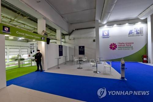 epa08957806 A view of the almost empty anti Covid vaccination center set up at the Mostra d'Oltremare in Naples, Italy, 22 January 2021. The cut in the supply of vaccines disrupted the vaccination campaign in Italy allowing less people to get the second booster injection. Pfizer pledged to resume full supplies of the covid19 vaccine to all EU countries as of next week. EPA/CIRO FUSCO